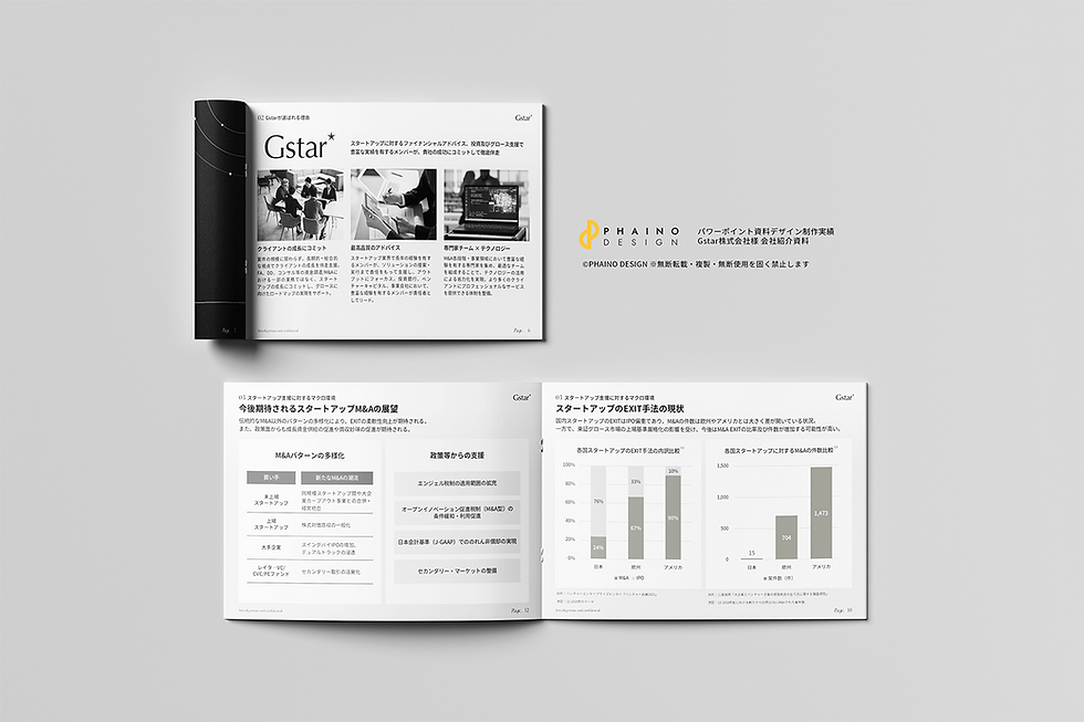 Gstar株式会社様の会社紹介資料をパワーポイントで制作いたしました。M&Aアドバイザリー事業を展開する企業としての信頼感と高級感を表現するために、黒とグレーを基調としたシンプルながら洗練されたデザインを提案。資料全体の構成や文章の推敲を行い、資料として適切な情報量と、視覚的に情報が伝わるデザインのバランスを調整し、資料をデザインしました。スライドマスターにはブランドイメージにあったテンプレートデザインを設定。今後の資料更新の際に活用できる、実用性と美しさを兼ね備えた会社紹介資料に仕上げました。